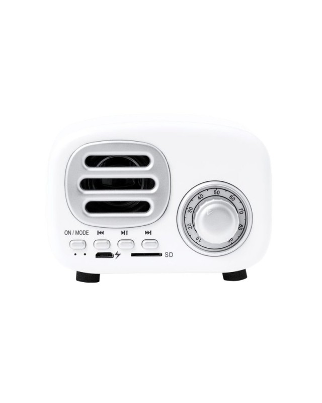Compatto altoparlante dallo stile vintage a forma di radio depoca e con una potenza di 3W. Con connessione Bluetooth per una libertà senza fili, per riprodurre musica ed essere eleganti allo stesso tempo. Con indicatori luminosi, slot per schede Micro SD fino a 64 GB e batteria da 500 mAh. Presentato in unattraente scatola dal design kraft, con manuale di istruzioni in inglese e spagnolo. - Lunghezza: 9.1 cm - Larghezza: 6 cm - Peso: 200 gr