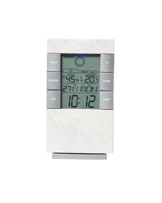 Stazione meteorologica in fibra di grano, con termometro e igrometro. Funzioni di ora, calendario, sveglia e giorno della settimana, facilmente visibili sul display retroilluminato. Con base di appoggio e gancio per essere appesa. Alimentato a batterie (2xAAA non incluse) e presentata in unattraente scatola dal design kraft. Manuale di istruzioni disponibile in inglese e spagnolo.La fibra di grano promuove luso di materie prime naturali, riducendo così le emissioni inquinanti. - Lunghezza: 8 cm - Larghezza: 4 cm - Peso: 105 gr