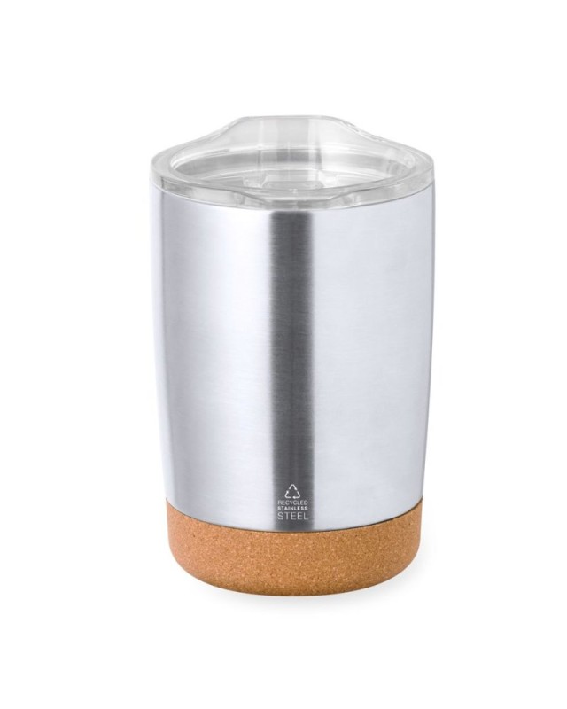 Bicchiere da tavolo in acciaio inox riciclato con capacità di 350 ml. In una combinazione di base in sughero naturale e corpo in acciaio inox riciclato con finitura argentata. Con doppia parete per una migliore e più duratura conservazione della temperatura. Originale tappo trasparente con apertura facilitata e logo Recycled Stainless Steel. È ideale per la tua scrivania, tavolo o qualsiasi superficie dove puoi goderti la tua bevanda preferita.Lacciaio è uno dei materiali più ricercati e si trova praticamente ovunque, dai prodotti di uso quotidiano alle grandi costruzioni. Le sue innumerevoli proprietà, tra cui la durata e lalto grado di riutilizzabilità, lo rendono unalternativa molto apprezzata nelle soluzioni di sostenibilità. Opportunamente trattato, consente di ottenere nuove risorse di uso infinito. - Diametro: 8.7 cm - Peso: 245 gr