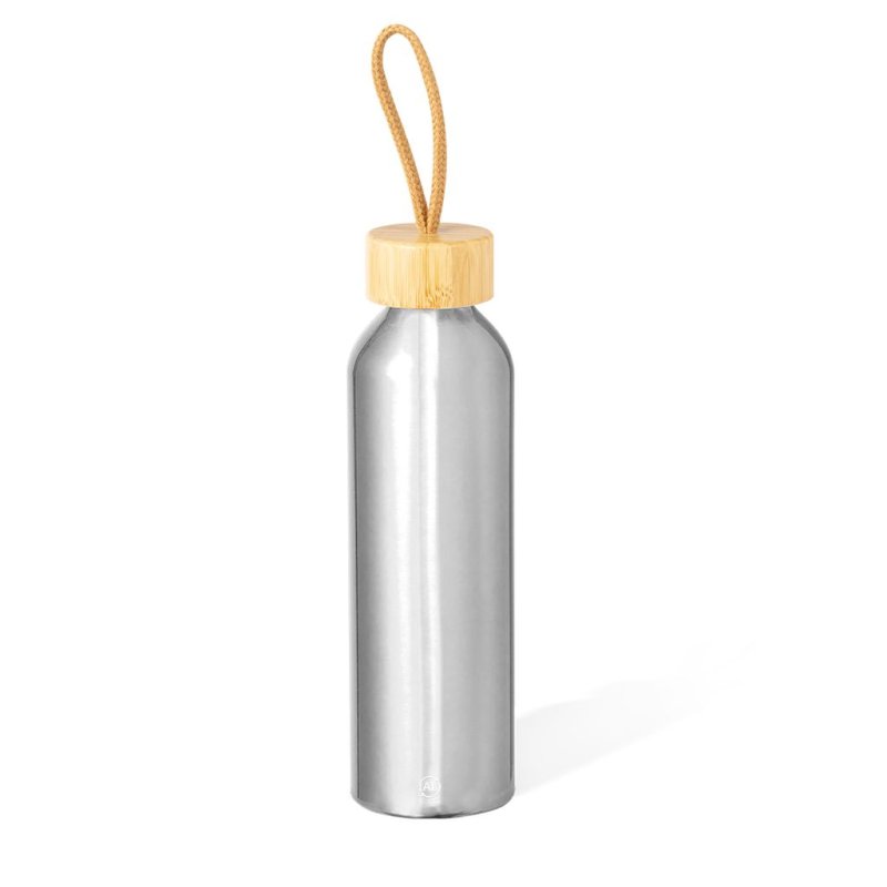 Borraccia in Alluminio Riciclato con capacità di 600 ml. Dagli originali e vari colori pastello metallizzati. Tappo a vite in bambù con cordino intrecciato. Presentato in una scatola di design kraft. - Diametro: 6.6 cm - Peso: 60 gr