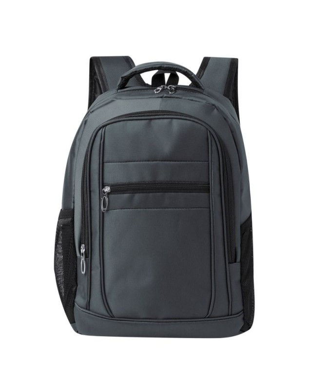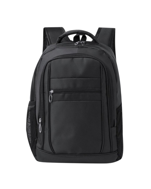 Zaino realizzato in resistente nylon 600D. Presenta una tasca principale con chiusura a cerniera e doppio tiretto. Interno con tasche imbottite per tablet fino a 10" e laptop fino a 15". Due tasche frontali aggiuntive. Schienale e spallacci sono imbottiti e regolabili, realizzati in tessuto traspirante. Comoda cinghia superiore imbottita e tasche laterali in rete. Disponibile in colori eleganti, con accessori neri. Confezionato singolarmente in un sacchetto riciclato. - Lunghezza: 32 cm - Larghezza: 21 cm - Peso: 480 gr