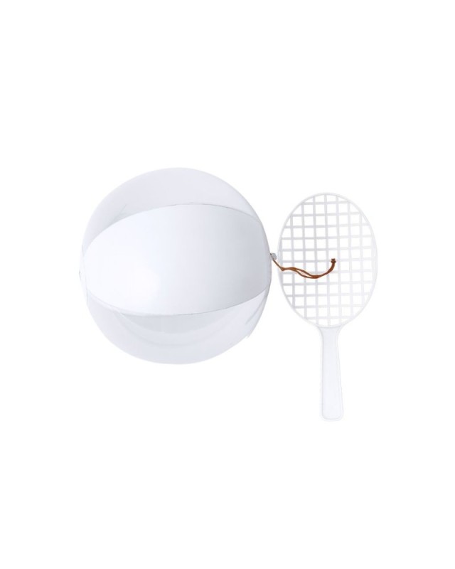 Divertente set composto da racchetta e pallina con valvola di gonfiaggio in una combinazione di bianco e semitrasparente, uniti da un elastico. Ogni set è presentato in una borsa riciclata. - Peso: 60 gr