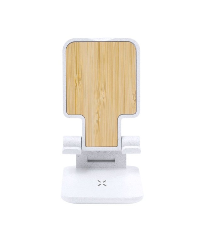 Originale supporto con caricatore wireless integrato da 15W. Pieghevole e realizzato in una combinazione di fibra di grano e bambù. Regolabile in altezza, con protezione in gomma antiscivolo sulla base di ricarica e supporto. In una sobria finitura bianca e con base di ricarica in bambù. Cavo di tipo C incluso e manuale di istruzioni in spagnolo e inglese. Presentato in unattraente scatola di design.La fibra di grano favorisce l’utilizzo di materie prime naturali, riducendo così le emissioni inquinanti.Materiali come il bambù favoriscono l’utilizzo di materie prime naturali, riducendo le emissioni inquinanti. Deriva da una pianta di grande resistenza e versatilità, di rapida crescita e rigenerazione, costituendo unottima alternativa allutilizzo del legno tradizionale.Prodotto secondo gli standard RoHS e in conformità con i seguenti requisiti di sicurezza:Sistema di protezione dal surriscaldamento.Sistema di protezione da sovraccarico.Sistema di bloccaggio per evitare cortocircuiti. - Lunghezza: 6.6 cm - Larghezza: 11 cm - Peso: 145 gr