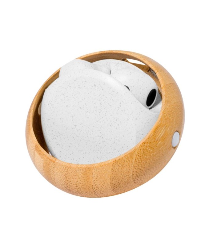 Auricolari in-ear con connessione Bluetooth 5.0, ciascuna con una batteria al litio da 30 mAh. Progettate ergonomicamente, includono un pulsante touch control integrato nellauricolare, con base di ricarica abbinata da 300 mAh e luce LED sullo stato di carica. Funzione vivavoce e ricaricabili, con cavo di tipo C incluso. Sono conservati in unoriginale custodia ad apertura rotante, con base di ricarica in fibra di grano e cornice circolare in bambù. Presentati in una accattivante scatola dal design kraft.Materiali come il bambù favoriscono l’utilizzo di materie prime naturali, riducendo le emissioni inquinanti. Deriva da una pianta di grande resistenza e versatilità, di rapida crescita e rigenerazione, costituendo unottima alternativa allutilizzo del legno tradizionale.Le capacità indicate in tutte le nostre batterie ausiliarie esterne sono reali, tutte incorporano batterie di grado A e non riciclate, con una vita utile di almeno 500 cicli di carica e secondo le normative CE. Inoltre, sono prodotti in conformità agli standard RoHS e in conformità ai seguenti requisiti di sicurezza:Sistema di protezione da sovraccarico della power bank.Sistema completo di protezione dallo scarico che garantisce una maggiore durata del power bank.Sistema di bloccaggio per evitare cortocircuiti.Sistema di trasferimento di carica costante, in base alla capacità del dispositivo di destinazione. - Diametro: 5.7 cm - Peso: 35 gr