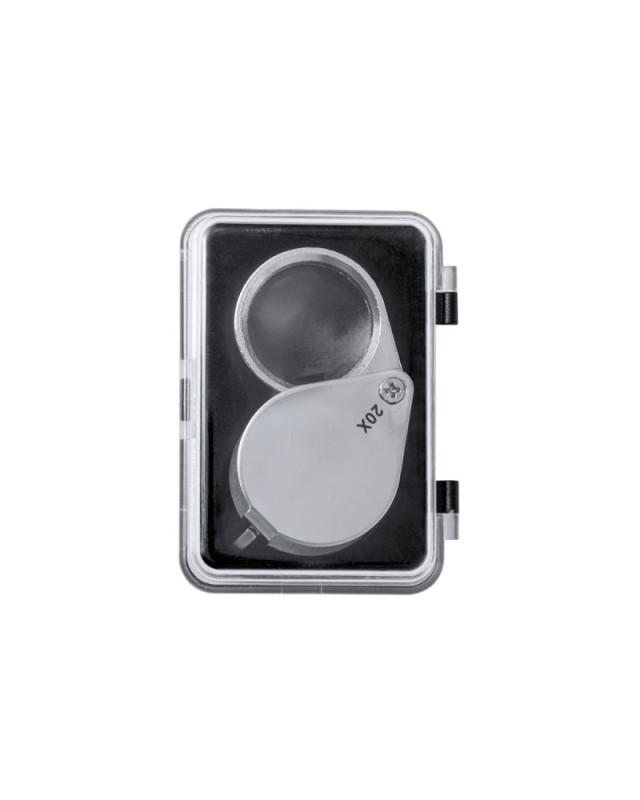 Lente dingrandimento pieghevole 20x realizzata in metallo resistente. Elevato potere di ingrandimento per ottenere una visione molto ravvicinata dei più piccoli dettagli, con ingrandimento senza distorsioni. Ideale per ispezionare piccoli oggetti, testi, ecc. Inoltre, è dotato di accessorio per appenderlo e viene fornito in una custodia con interno imbottito per una maggiore protezione. Presentata in una scatola di cartone nera. - Lunghezza: 3.5 cm - Larghezza: 2.5 cm - Peso: 30 gr