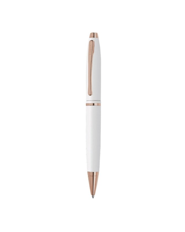 Penna a sfera con meccanismo retrattile, design bicolore distintivo in bianco con eleganti accenti in oro rosa. Corpo in metallo con finitura liscia e clip originale con logo. Presentata in un elegante astuccio nero singolo con il logo del marchio e interno morbido tipo camoscio abbinato. Inchiostro nero. - Diametro: 1.2 cm - Peso: 35 gr