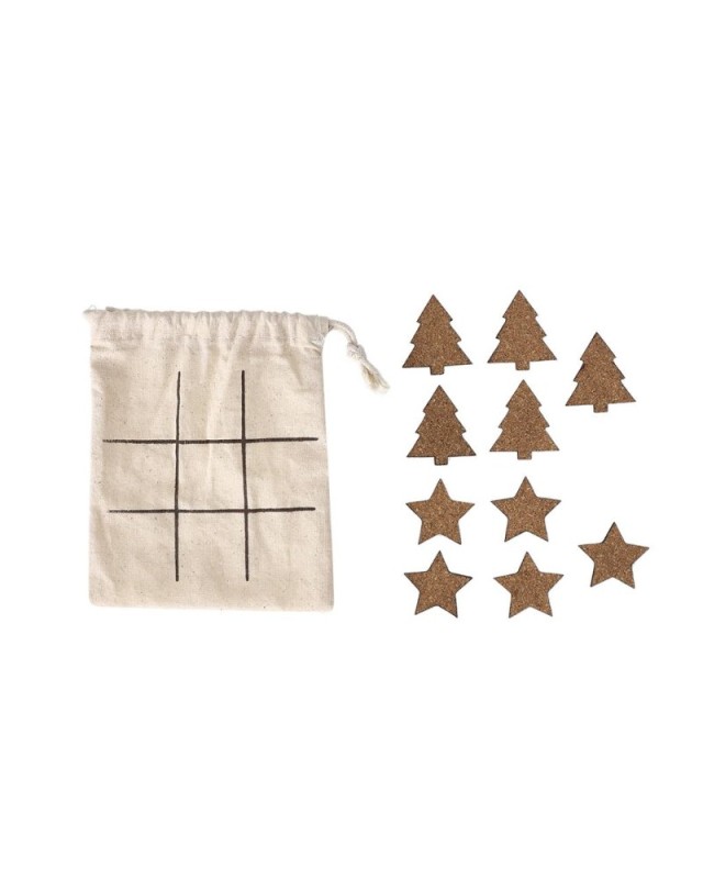 Gioco del tris realizzato in sughero naturale. Include 5 pedine a forma di albero e 5 pedine a forma di stella. Presentato in una borsa di cotone con chiusura a coulisse da utilizzare come tavola da gioco.Realizzato con elementi a base vegetale per promuovere luso di materie prime naturali e ridurre le emissioni inquinanti. - Lunghezza: 12.5 cm - Peso: 13 gr