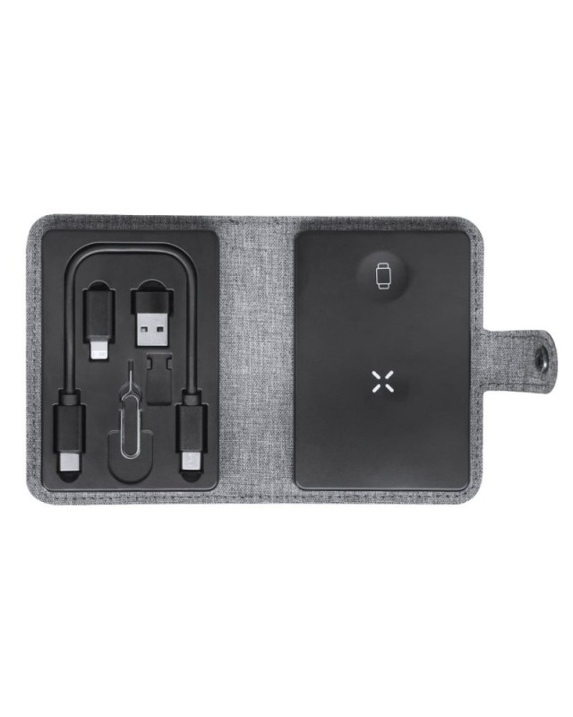 Base di ricarica completa realizzata in 300D RPET. Custodia compatta con chiusura a bottone e dock di ricarica wireless Qi per smartphone, auricolari e smartwatch. Fornito con cavo di connessione Type-C ad entrambe le estremità, più adattatori USB e lightning/micro USB. Il set è completato da un estrattore di schede SIM e un vano per riporre una scheda Micro SIM. Con logo RPET.Il materiale RPET è realizzato in plastica riciclata, promuovendo così il riutilizzo dei rifiuti di plastica e contribuendo alla sostenibilità del pianeta. - Lunghezza: 8.4 cm - Larghezza: 2.5 cm - Peso: 93 gr
