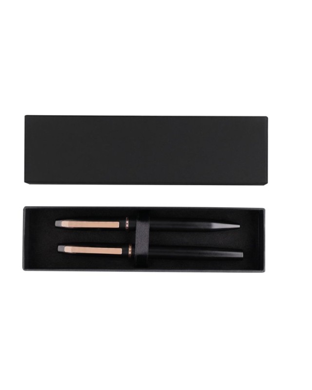 Set di penna a sfera e penna roller in alluminio riciclato, dal design elegante in nero opaco con finiture distintive in oro rosa. Penna a sfera con meccanismo a rotazione e penna roller con cappuccio, entrambe con clip in metallo. Inchiostro blu e logo in alluminio riciclato. Presentato in un elegante astuccio nero.Lalluminio riciclato è un materiale con possibilità di riciclaggio quasi infinite, che conserva le sue proprietà originali e consuma meno energia nel processo.Certificazione GRS (Global Recycled Standard), che garantisce lorigine riciclata del materiale utilizzato per produrre il prodotto. - Diametro: 1.1 cm - Peso: 82 gr