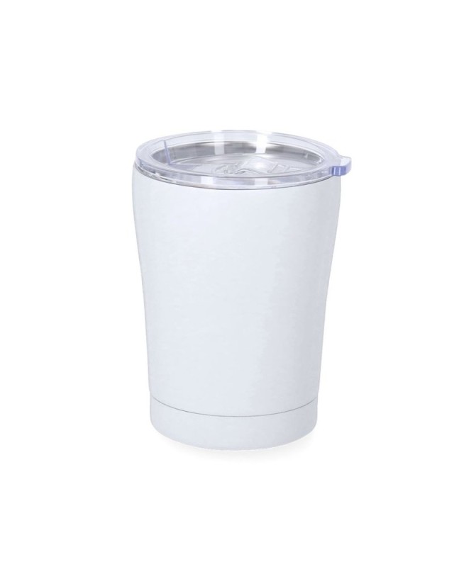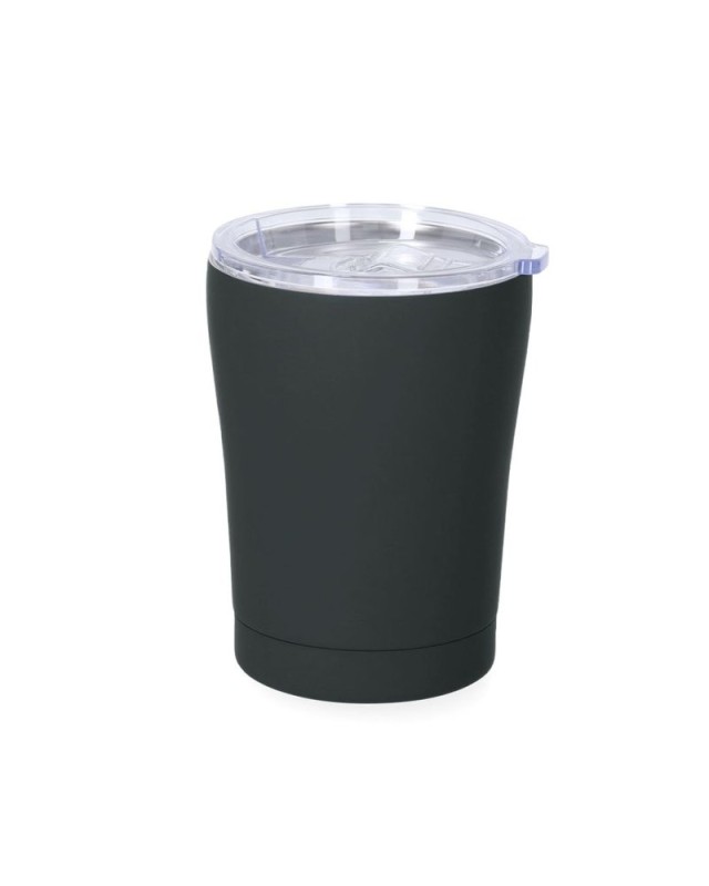 Tazza isolata realizzata in acciaio inossidabile a doppia parete con una capacità di 350 ml. Esterno con finitura in gomma opaca, appositamente progettata per la marcatura laser. Incluso coperchio trasparente a scatto, con dispenser e apertura facile, senza BPA. È ideale per la tua scrivania, tavolo o qualsiasi superficie dove puoi goderti la tua bevanda preferita. - Diametro: 8.8 cm - Peso: 240 gr