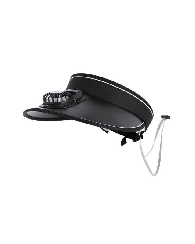Visiera con Ventilatore Ricaricabile e Regolabile. Incorpora un ventilatore integrato nella visiera, con 3 velocità regolabili e posizione orientabile, fornendo una ventilazione personalizzata ed efficace. Con interno imbottito per maggiore comfort, nastro elastico regolabile e chiusura in PP che garantisce una vestibilità perfetta. Include cordino di trasporto con accessorio di regolazione per facilitare l'uso e il trasporto e batteria ricaricabile con micro USB da 150 mAh. - Peso: 110 gr