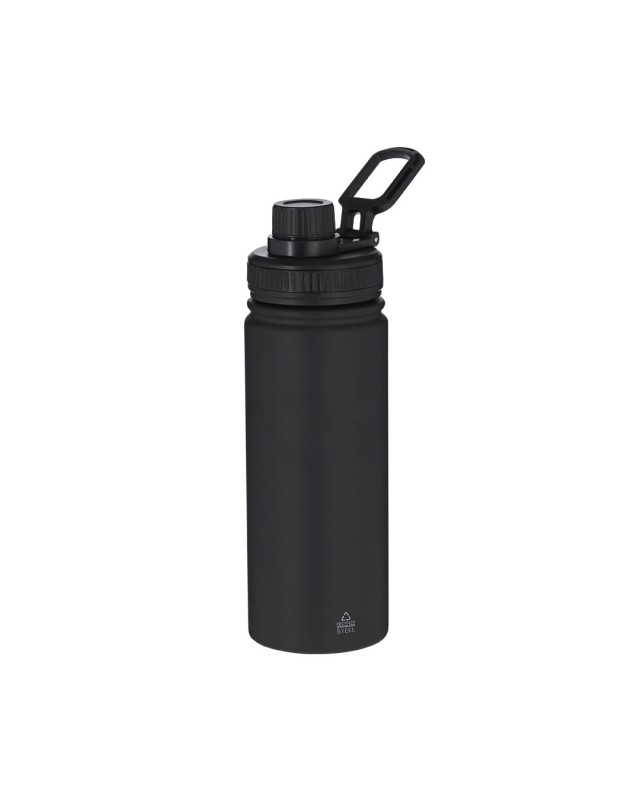 Bottiglia di Acciaio Inox Riciclato con capacità di 550 ml. Include coperchio di colore nero con sistema di chiusura a vite, presa in silicone per una tenuta ottimale, dosatore e maniglia per trasporto regolabile. In finitura opaca progettata specificamente per il laser. Include distintivo di Acciaio Inox Riciclato. L'acciaio è uno dei materiali più richiesti e che può essere trovato quasi ovunque, da prodotti di uso quotidiano a grandi costruzioni. Con innumerevoli proprietà, tra cui la durabilità e l'elevato grado di riutilizzo, lo rende un'alternativa molto apprezzata nelle soluzioni di sostenibilità. Adeguatamente trattato, consente di ottenere nuove risorse di utilizzo infinito. - Diametro: 7.4 cm - Peso: 290 gr