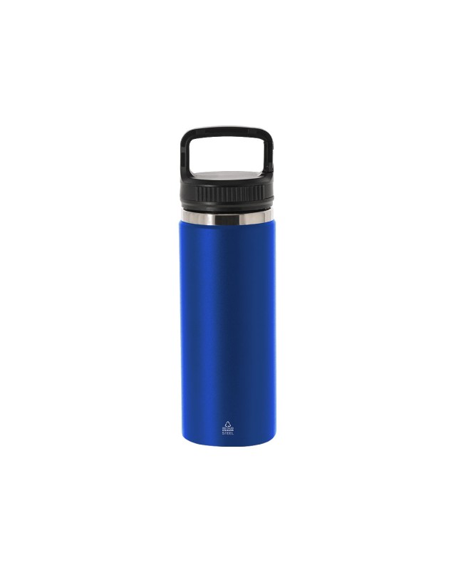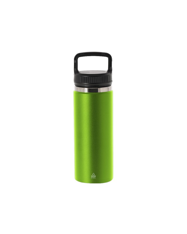 Bottiglia termica da 550 ml di capacità, realizzata in acciaio inox riciclato a doppia parete. Dispone di una maniglia funzionale con doppia funzione di moschettone, che facilita un trasporto comodo e versatile. Con tappo a vite e base di colore opaco, completata con un elegante anello decorativo in argento. Priva di BPA. L'acciaio è uno dei materiali più richiesti e che può essere trovato quasi ovunque, da prodotti di uso quotidiano a grandi costruzioni. Con innumerevoli proprietà, tra cui la durabilità e l'elevato grado di riutilizzo, lo rende un'alternativa molto apprezzata nelle soluzioni di sostenibilità. Adeguatamente trattato, consente di ottenere nuove risorse di utilizzo infinito. - Diametro: 7.3 cm - Peso: 270 gr