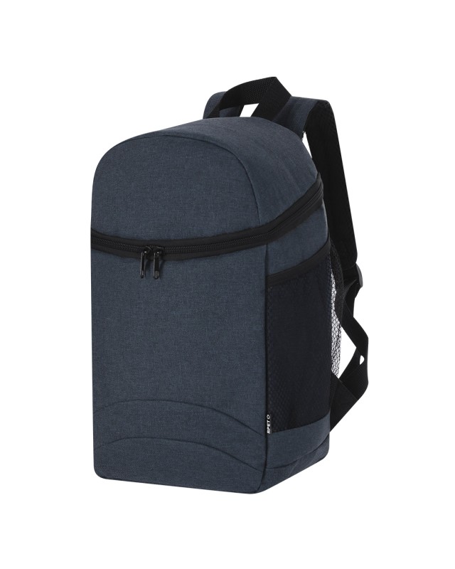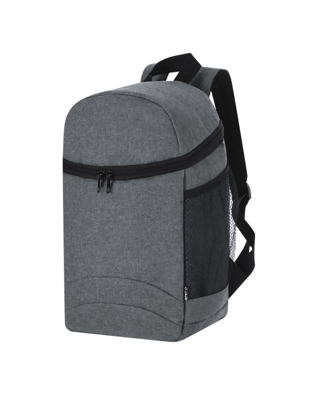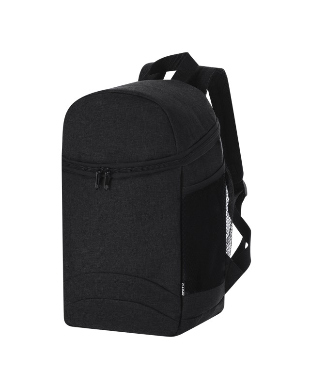 Zaino frigorifero di grande capacità realizzato in resistente poliestere RPET 600D di alta qualità. Scomparto principale con chiusura lampo a doppio cursore, con interno in PEVA. Con tasche laterali in rete. Cinghie delle spalle regolabili e imbottite. Include una fascia nella parte superiore. Completamente imbottito. Distintivo RPET sull'etichetta. Il materiale RPET è realizzato a partire da plastica riciclata, per promuovere il riutilizzo dei rifiuti plastici e contribuire alla sostenibilità del pianeta. - Lunghezza: 21.5 cm - Larghezza: 14 cm - Peso: 265 gr