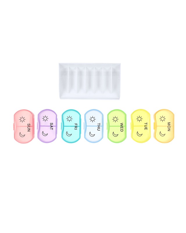 Dispenser settimanale in resistente PP. Include 7 scomparti individuali, ciascuno contrassegnato da un colore e le sigle corrispondenti al giorno della settimana, facilitando il suo utilizzo. Ogni scomparto è diviso in 2 caselle indipendenti, ideali per separare le dosi del mattino, pomeriggio o sera. - Lunghezza: 10.3 cm - Larghezza: 5 cm - Peso: 70 gr