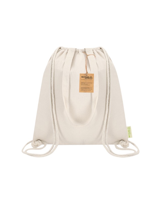 Borsa zaino frigorifero a corda realizzata in cotone riciclato 140g/m2. Con interno in alluminio. Con maniglie abbinate e rinforzate. Resistenza massima di 9kg. Include distintivo di cotone riciclato. - Lunghezza: 38 cm - Peso: 125 gr