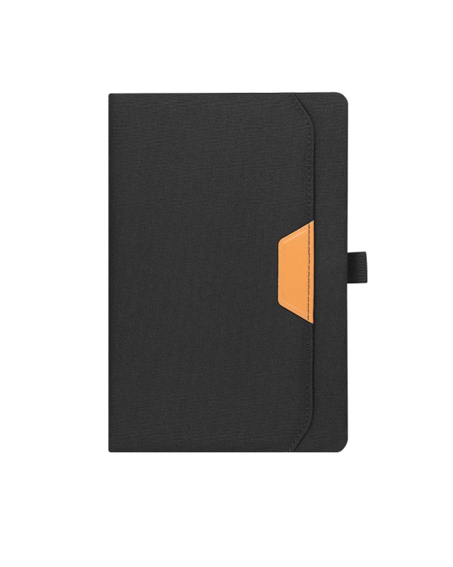 Blocco note in RPET, con una tasca esterna con distintivo dettaglio in PU marrone. Include 80 fogli di color crema a righe e supporto elastico per penna abbinato. Include distintivo RPET.Il materiale RPET è realizzato a partire da plastica riciclata, per promuovere il riutilizzo dei rifiuti plastici e aiutare la sostenibilità del pianeta. - Lunghezza: 14.5 cm - Larghezza: 1.4 cm - Peso: 280 gr