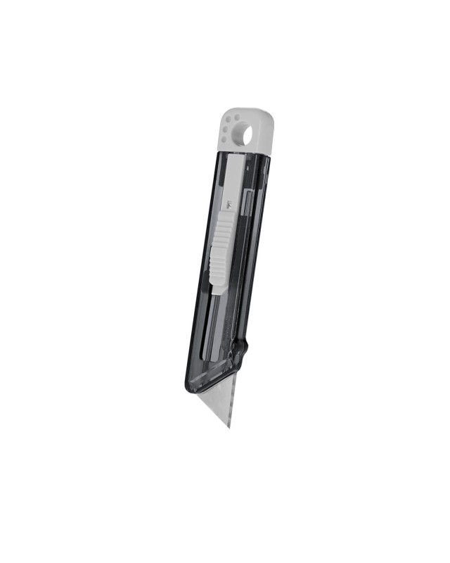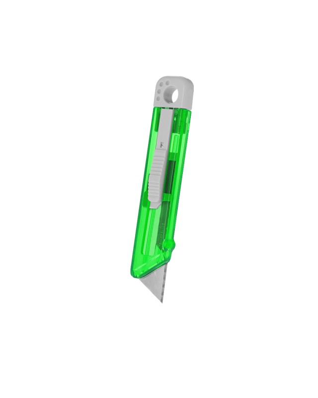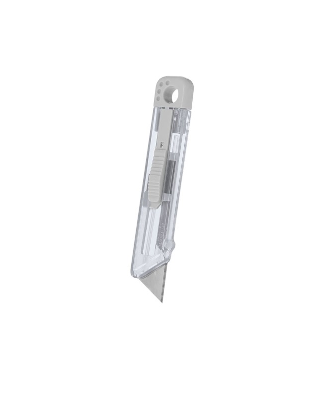 Cutter in PS di finitura traslucida. Con un meccanismo a pulsante di retrazione automatica e una lama in acciaio di 6 x 1,9 cm, senza sistema di blocco (stopper). - Lunghezza: 2.6 cm - Larghezza: 1.3 cm - Peso: 22 gr