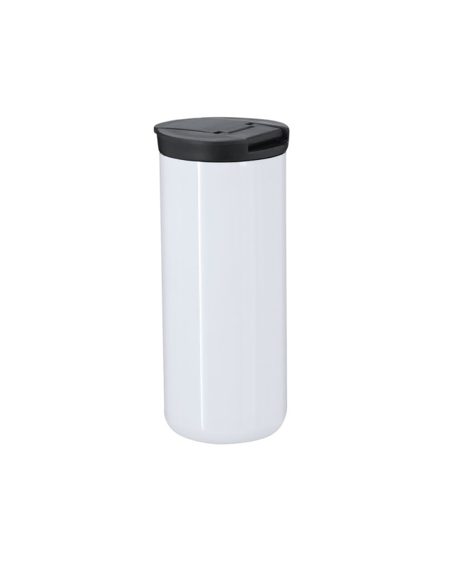 Vaso termico realizzato in acciaio inox a doppia parete e capacità di 370 ml. Progettato specificamente per la marcatura in sublimazione, finitura bianca lucida. Dotato di un dosatore sul coperchio di colore nero, progettato per evitare perdite e privo di BPA. - Diametro: 7 cm - Peso: 206 gr