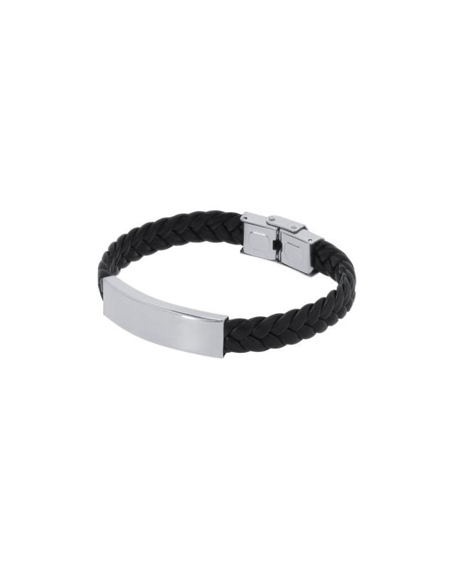 Bracciale in pelle sintetica nera decorato con una placca in acciaio inox lucido dal design piatto. Presenta un originale meccanismo di chiusura di sicurezza. - Lunghezza: 21 cm - Larghezza: 0.5 cm - Peso: 13 gr
