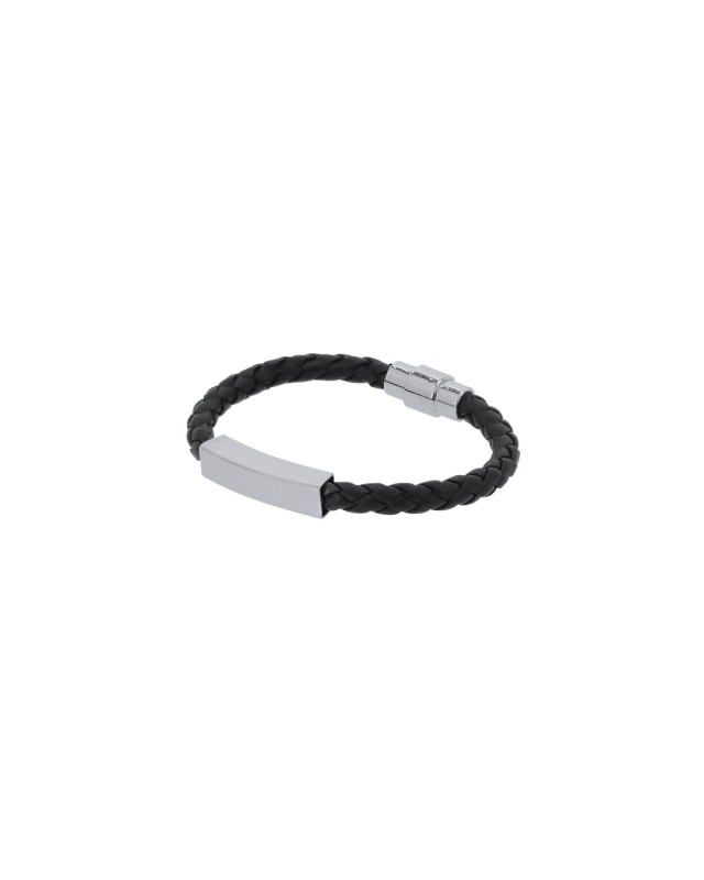 Bracciale in pelle sintetica nera decorato con una placca in acciaio inox lucido dal design piatto. Presenta un originale meccanismo di chiusura di sicurezza magnetico. - Lunghezza: 20 cm - Larghezza: 0.6 cm - Peso: 8.5 gr