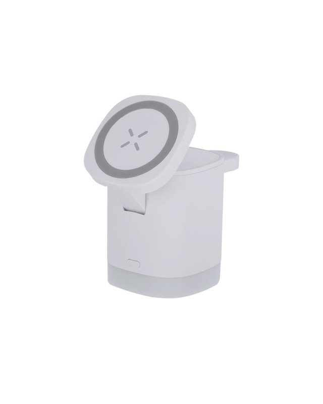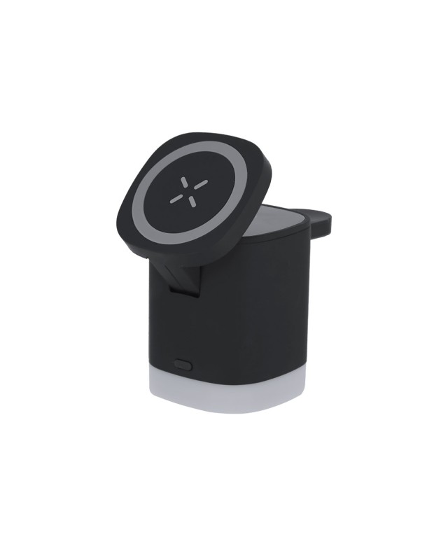 Caricatore wireless magnetico 3 in 1 da 15W, realizzato in ABS riciclato (RABS). Progettato per la ricarica simultanea dello smartphone, degli auricolari e dello smartwatch.Include lampada integrata nella base con 2 modalità di luce regolabili in bianco.Cavo di tipo C incluso. Un gadget tutto in uno: pieghevole, portatile, versatile e di design funzionale.Il RABS è una plastica altamente riciclabile di grande resistenza e con molteplici applicazioni che lo rendono una soluzione eco-friendly.Fabbricato secondo gli standard RoHS e in conformità con i seguenti requisiti di sicurezza:Sistema di protezione contro il surriscaldamento.Sistema di protezione contro il sovraccarico.Il sistema di bloccaggio per evitare cortocircuiti. - Lunghezza: 6.4 cm - Larghezza: 6.4 cm - Peso: 190 gr
