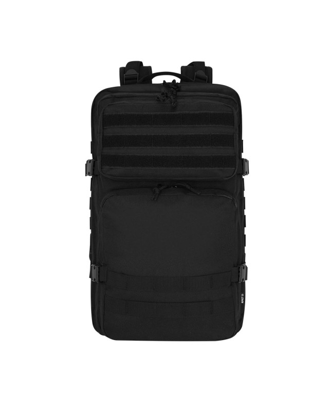 Zaino tattico in resistente poliestere RPET 600D. Parte frontale con molteplici tasche, oltre a supporti elastici e velcro per appendere gli accessori necessari durante l'avventura. Scomparto principale con chiusura a cerniera con doppio tiratore e tasche interne con vari compartimenti, con capacità per laptop da 17 pollici. Include angoli rinforzati e maniglia di trasporto. Con schiena e cinghie spalline imbottite e regolabili, e cinghie frontali per maggiore comfort. Etichetta con distintivo di RPET.Il materiale RPET è realizzato a partire da plastica riciclata, per così incoraggiare il riutilizzo dei rifiuti plastici e contribuire alla sostenibilità del pianeta. - Lunghezza: 30 cm - Larghezza: 28 cm - Peso: 1030 gr