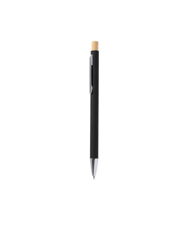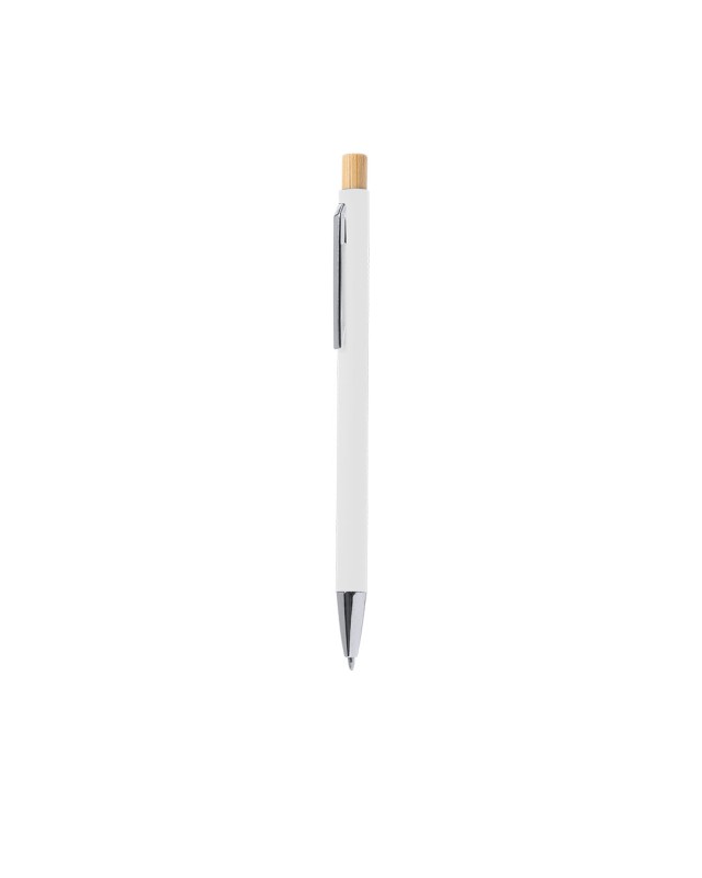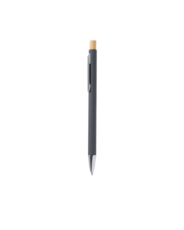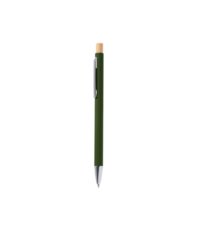 Penna a sfera con meccanismo a pulsante realizzata in alluminio riciclato. Pulsante in bambù e corpo con finitura in gomma opaca. Clip metallica e distintivo di alluminio riciclato nella parte superiore della penna, in inchiostro blu.L'alluminio riciclato è un materiale con possibilità di riciclaggio quasi infinite, senza perdere le sue proprietà originali e consumando meno energia in questo processo.Certificazione GRS (Global Recycled Standard / Standard di Riciclaggio Globale), che garantisce l'origine riciclata del materiale utilizzato per fabbricare il prodotto.Materiali come il Bambù promuovono l'uso di materie prime naturali riducendo le emissioni inquinanti. Inoltre, il bambù proviene da una pianta di grande resistenza e versatilità, con crescita e rigenerazione rapide, costituendo un'ottima alternativa all'uso del legno tradizionale.Cartuccia Jumbo - Diametro: 0.9 cm - Peso: 13 gr
