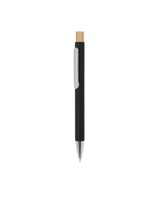 Elegante penna realizzata in Alluminio Riciclato. Corpo con forma esagonale distintiva, con clip e punta cromate. Con meccanismo a pulsante realizzato in bambù e inchiostro blu. Con logo distintivo di Alluminio Riciclato marcato sulla canna.L'Alluminio Riciclato è un materiale con possibilità di riciclaggio quasi infinite, senza perdere le sue proprietà originali e consumando meno energia in questo processo.Certificazione GRS (Global Recycled Standard / Standard di Riciclaggio Globale), che garantisce l'origine riciclata del materiale utilizzato per fabbricare il prodotto.Materiali come il bambù promuovono l'uso di materie prime naturali, riducendo le emissioni inquinanti. Proviene da una pianta di grande resistenza e versatilità, con crescita e rigenerazione rapide, costituendo un'ottima alternativa all'uso del legno tradizionale. - Lunghezza: 1 cm - Larghezza: 1 cm - Peso: 16 gr