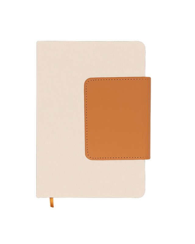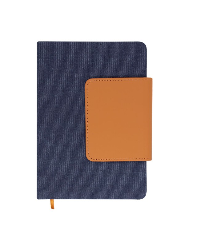 Blocco note A5 realizzato in combinazione di Canvas Riciclato con PU Riciclato. Dal design elegante con patta marrone e chiusura magnetica coordinata, con pratico portatessere all'interno. Interno con 80 fogli color crema disposti a righe e segnalibro in tessuto coordinato con la patta. Con distintivo di PU Riciclato.Il PU Riciclato si distingue per la sua resistenza e elasticità. Questo materiale riciclato e riciclabile è una scelta sostenibile che recupera le fibre scartate nei processi di produzione, minimizzando così lo spreco di materiale e contribuendo al contempo a ridurre l'impatto ambientale, mantenendo al contempo le sue proprietà originali. - Lunghezza: 15.5 cm - Larghezza: 2.1 cm - Peso: 280 gr