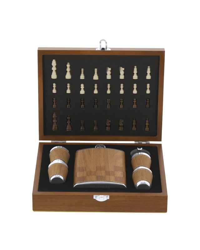 Set originale di flask con finitura in legno e design a scacchi. Include chiusura di sicurezza e accessori in acciaio inossidabile rivestiti in PU. Contiene una flask di 220 ml con tappo a vite antigoccia, quattro bicchierini e un pratico imbuto. Presentato in una elegante custodia con scacchiera e un interno in schiuma sagomata, incorpora 16 pezzi di scacchi in colore beige e 16 in marrone. - Lunghezza: 24 cm - Larghezza: 18.3 cm - Peso: 750 gr