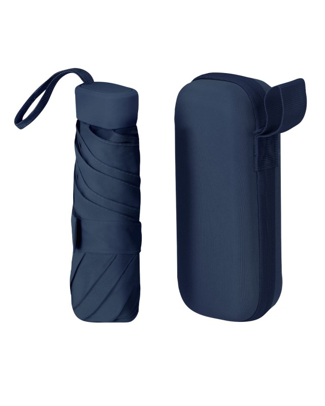 Ombrello pieghevole di 90 cm di diametro in materiale poliestere 190T con 6 pannelli. Con apertura manuale, sistema antivento e stecche in fibra di vetro. Manico compatto e nastro coordinato. Presentato in una custodia rigida di trasporto realizzata in PU con chiusura a zip e nastro coordinato. - Diametro: 90 cm - Peso: 220 gr