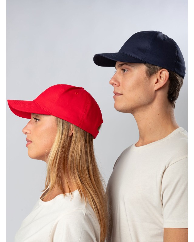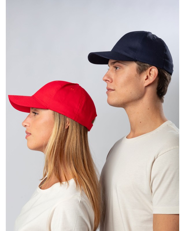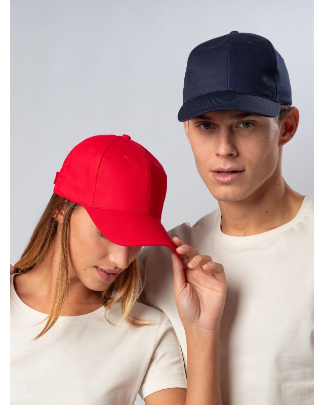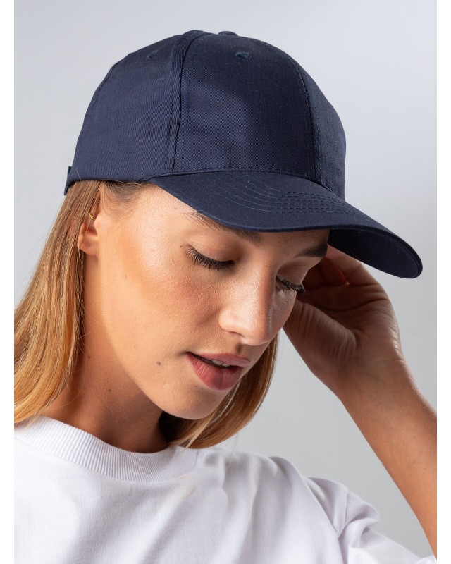 100% cotone. Cappellino a 6 pannelli dal design classico e funzionale, perfetto per ogni occasione. Dotato di una chiusura regolabile in velcro, per una vestibilità personalizzata. Fascia anti-sudore in poliestere e occhielli cuciti. Pannello frontale rigido e visiera pre-curvata. Etichetta removibile.