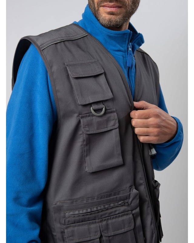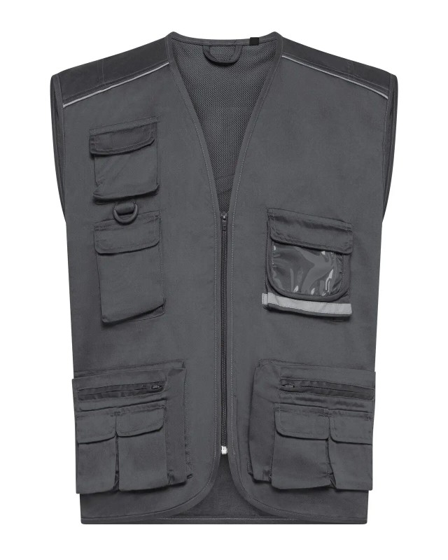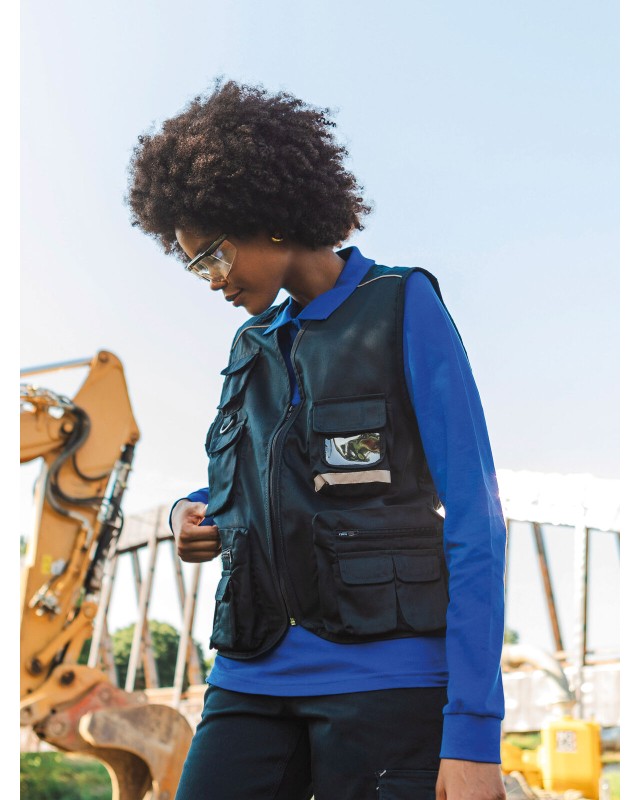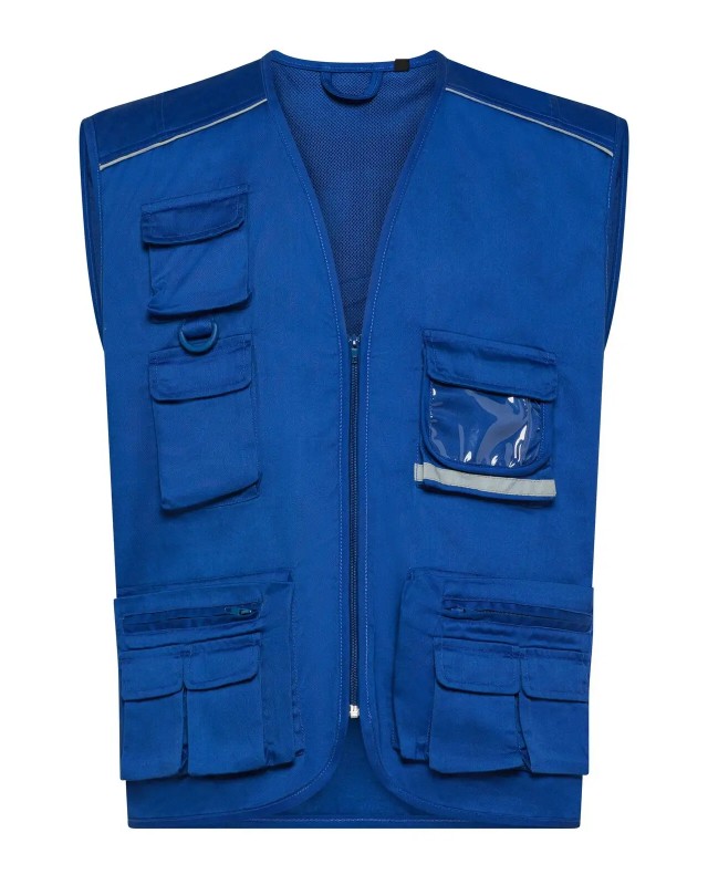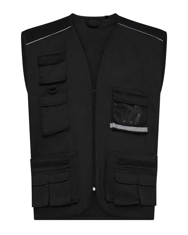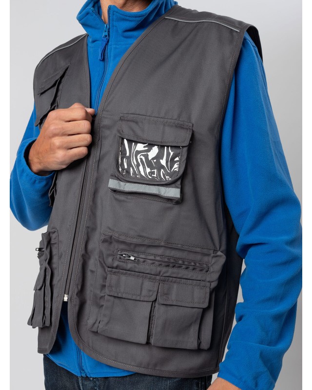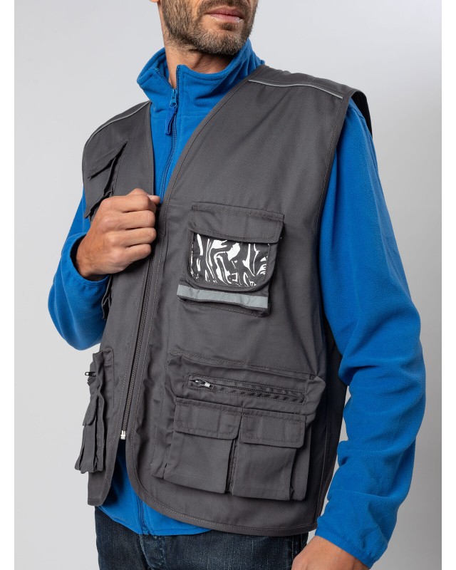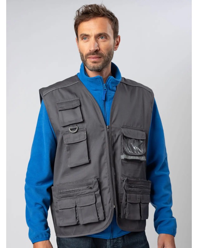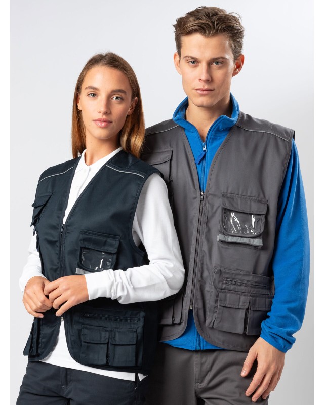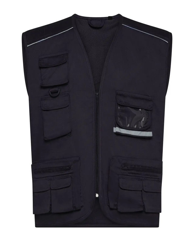 80% poliestere, 20% cotone. Gilet multitasche unisex collo a V, chiusura con zip a vista, 10 tasche anteriori incluso taschino per cellulare e porta badge, 2 tasche posteriori. Piping riflettenti sulle spalle. Fodera interna in rete di nylon. Ideale per il lavoro. Etichetta taglia tessuta al collo e etichetta con logo, composizione, istruzioni di lavaggio sul fianco strappabile.