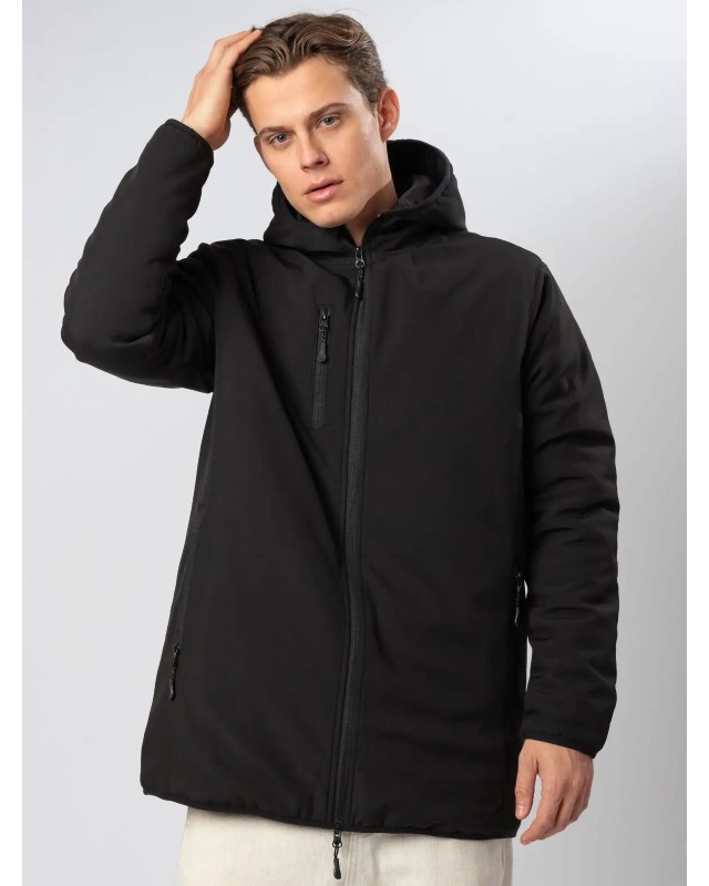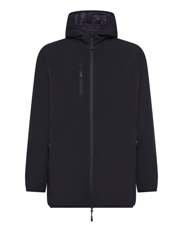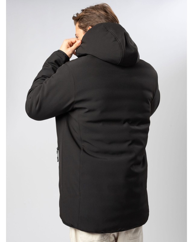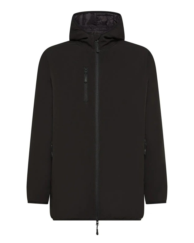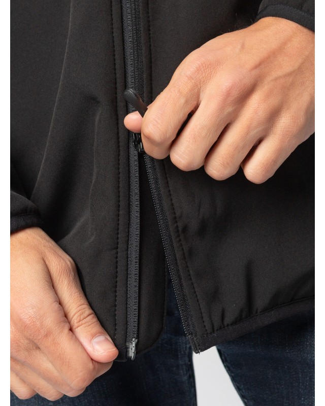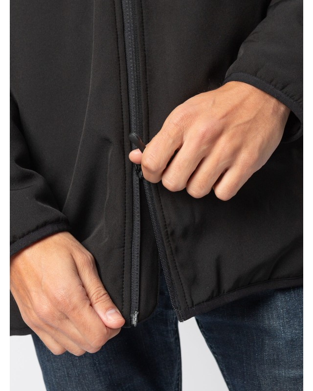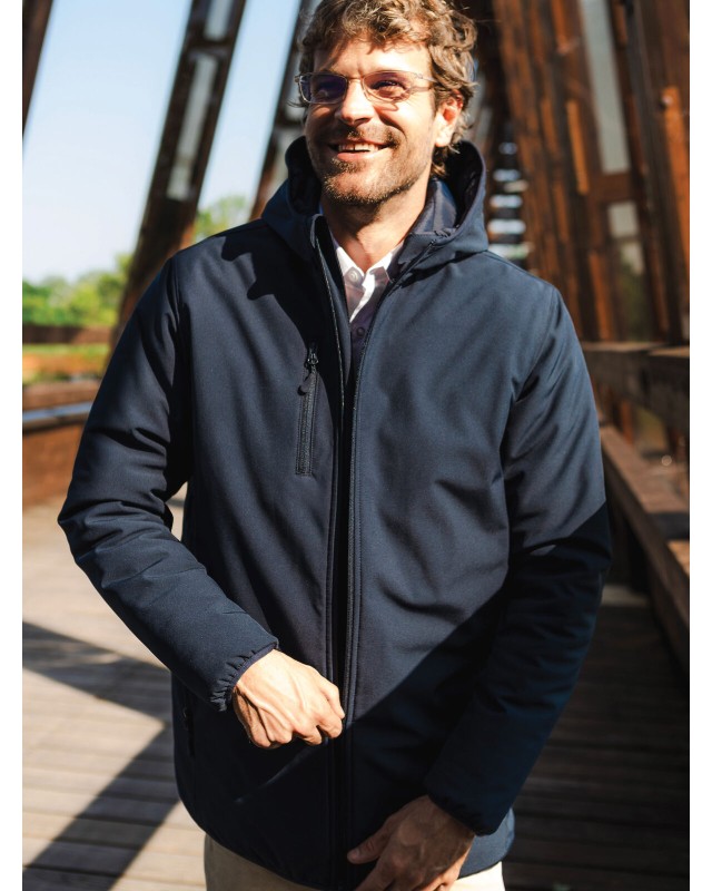 Tessuto esterno: 94% poliestere riciclato, 6% elastan Imbottitura:100% poliestere (riciclato). Fodera: 100% nylon 380T. Parka in Softshell 3 strati con cappuccio, tessuto morbido ed ecosostenibile, esterno antivento e antipioggia, (impermeabilità 5000 w/p, traspirabilità 500 mvp). Interno imbottito. Polsini elasticizzati. Tre tasche sul davanti con zip, una tasca interna. Apertura con zip bidirezionale, tira zip in plastica con fibra riflettente. Zip per personalizzazione a fondo capo. Etichetta taglia tessuta al collo e etichetta con logo, composizione, istruzioni di lavaggio sul fianco strappabile.