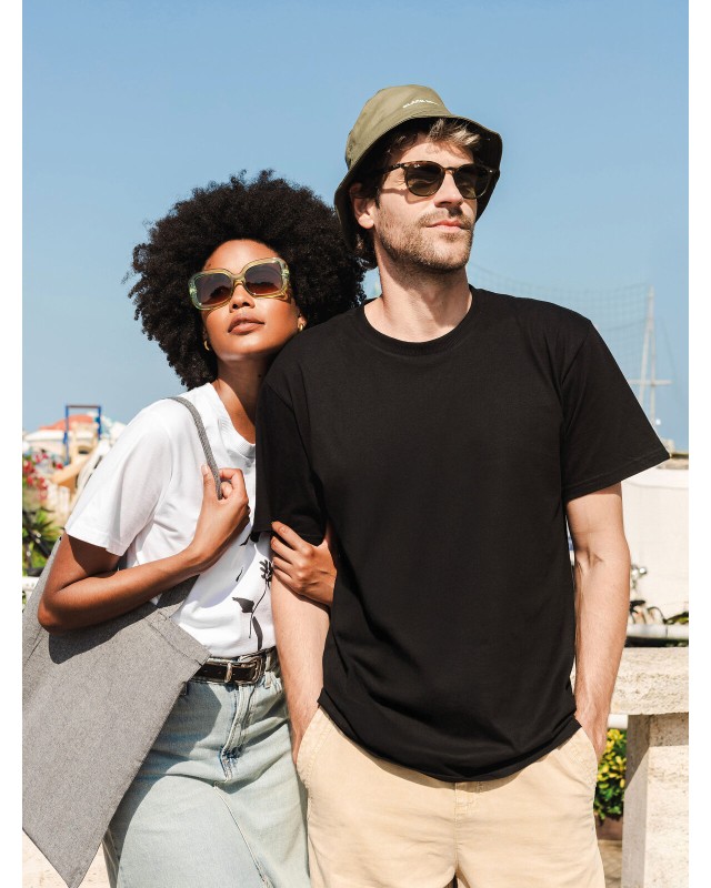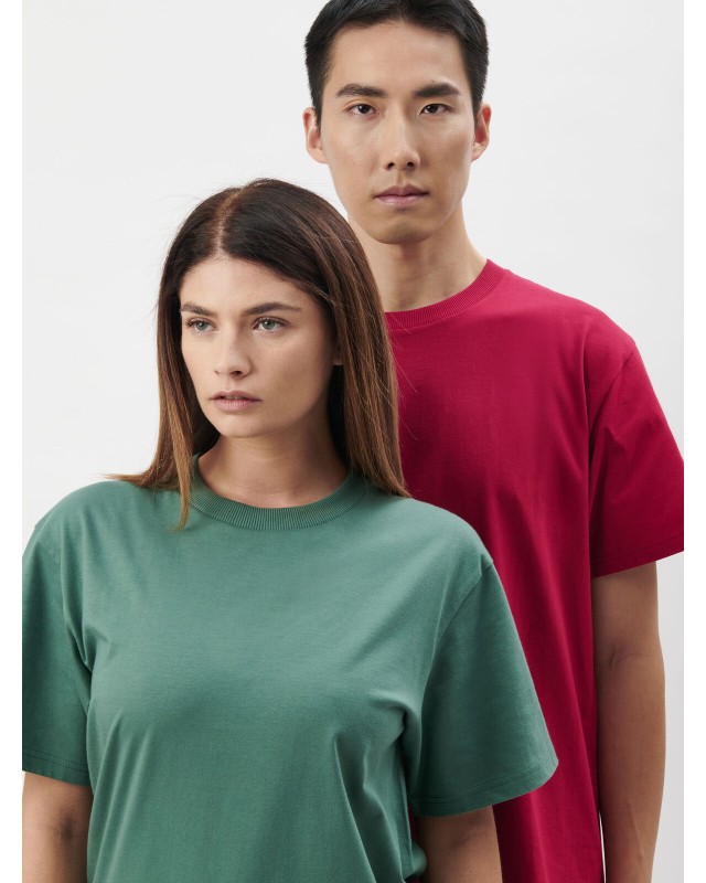 100% cotone organico in conversione. T-shirt realizzata in pesante cotone ecosostenibile, girocollo manica corta, vestibilità boxy fit tubolare, girocollo in costina 2x1 a doppio strato, nastro di rinforzo da spalla a spalla. Ideale per il merchandising. Etichetta taglia tessuta al collo e etichetta con logo, composizione, istruzioni di lavaggio sul fianco strappabile.