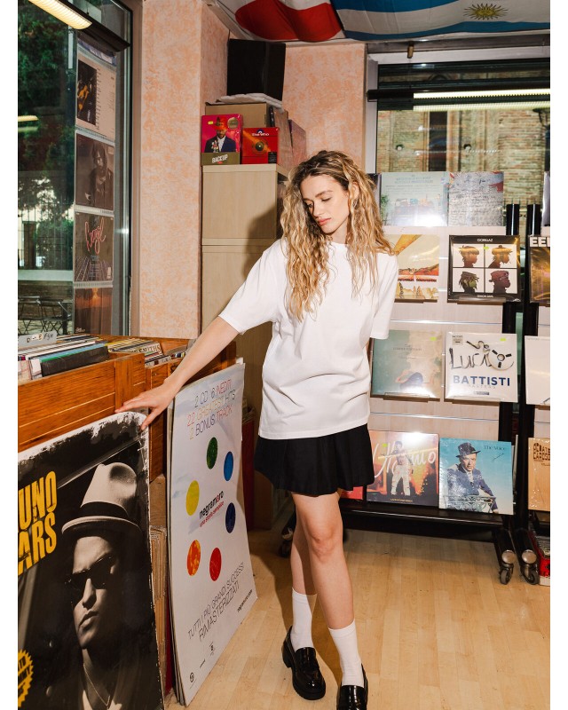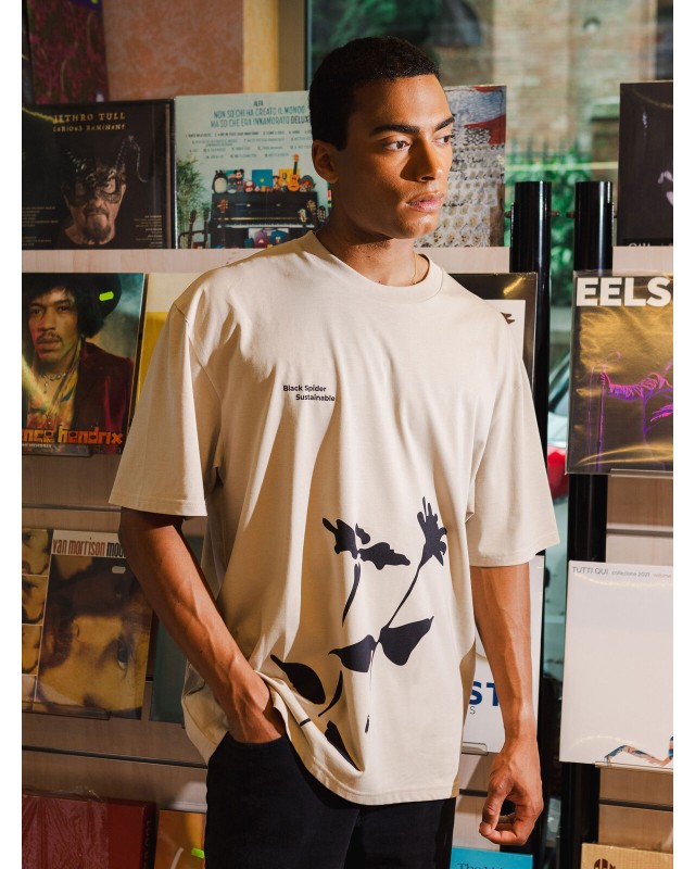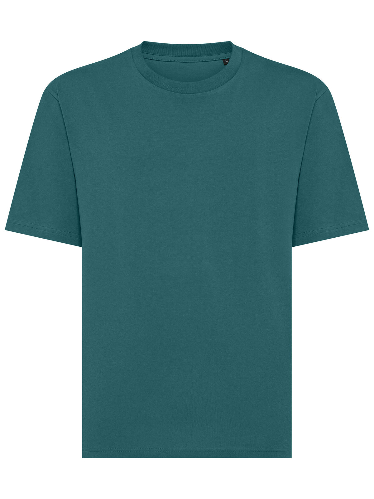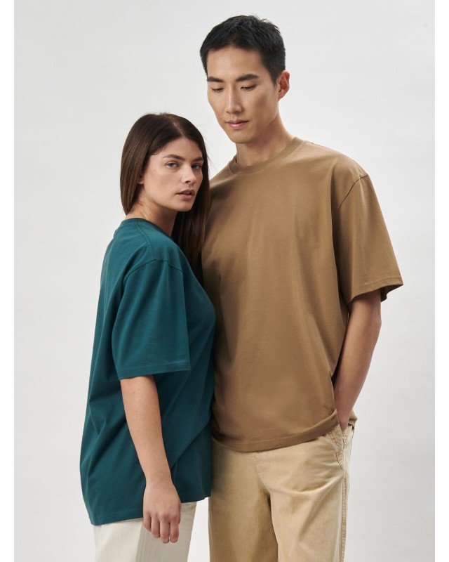 100% cotone organico in conversione. T-shirt girocollo genderless oversize dal look rilassato e moderno, manica corta, struttura con cuciture laterali, girocollo in costina a doppio strato, nastro di rinforzo da spalla a spalla per una maggiore durata nel tempo. Realizzata in morbido cotone ecosostenibile trattato ad enzimi. Etichetta taglia tessuta al collo ed etichetta laterale strappabile con logo, composizione e istruzioni di lavaggio.