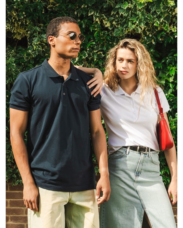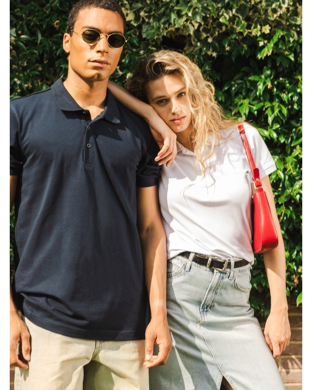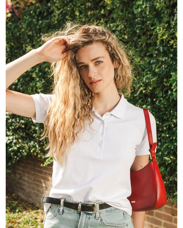 95% cotone organico in conversione, 5% elastan. Polo donna slim-fit in morbido tessuto ecosostenibile. Maniche corte set-in, struttura con cuciture e spacchetti laterali, 4 bottoni tono su tono. Collo e manica in costina, leggermente sfiancata. Etichetta taglia tessuta al collo e etichetta con logo, composizione, istruzioni di lavaggio sul fianco strappabile.