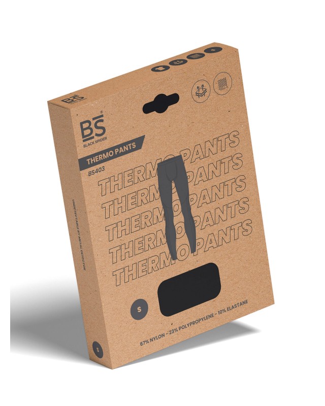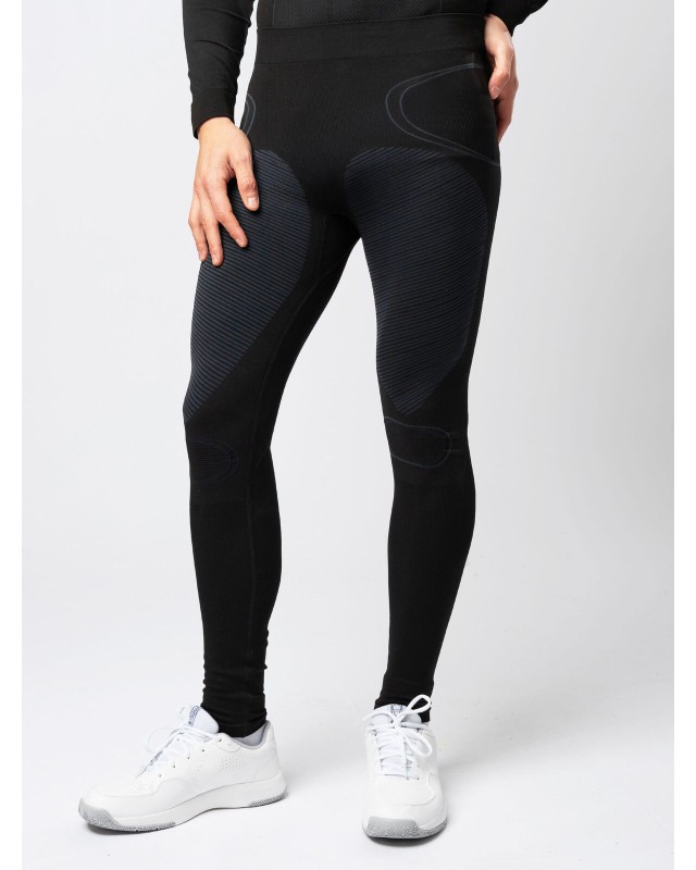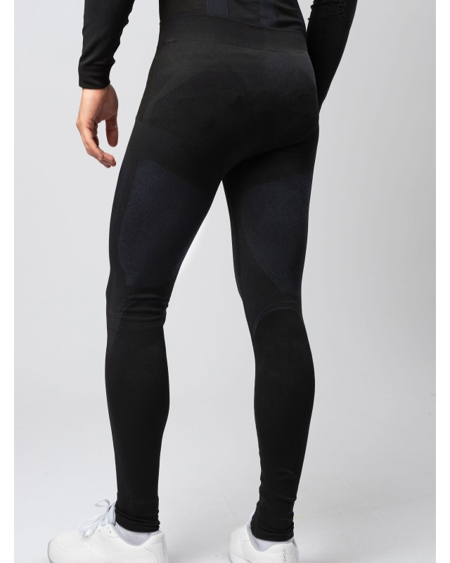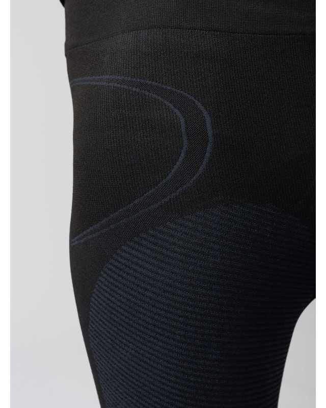 67% nylon, 23% polypropilene, 10% elastane. Pantalone termico. Tessuto morbido ed elasticizzato con motivi in rilievo e tramatura speciale di rinforzo su gambe e ginocchia e fianchi. Girovita e fondo gamba nello stesso tessuto della maglia. Senza cuciture per evitare il rischio di irritazione. Proprietà peculiari: tessuto traspirante e termoregolatore corporeo, non rilevabile dai metal detector. Etichetta removibile.