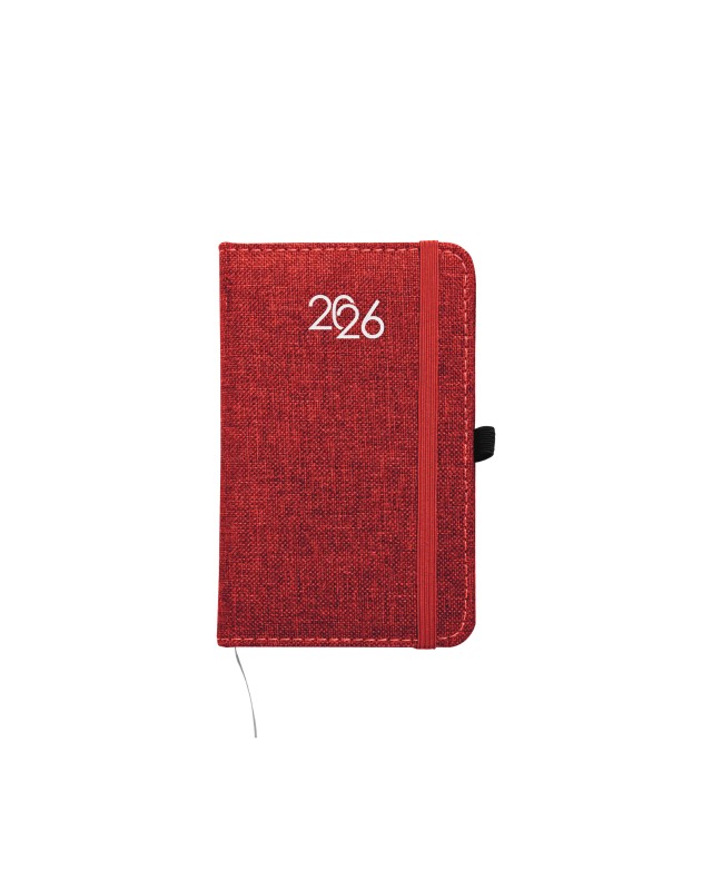 Agenda tascabile settimanale 2026, copertina rigida in PET riciclato con effetto mélange e impuntura perimetrale. Con elastico per la chiusura e anello porta penna. 12 mesi. 64 pagine in carta bianca da 70 g/m2. Copertina personalizzabile. Materiale: Rpet Dimensioni: 9X14 CM Grammatura: 64 PAGES 70GSM WHITE PAPER