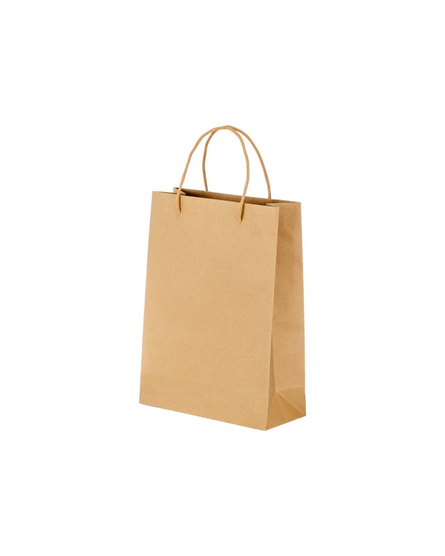 Sacchetto in carta naturale riciclata da 150 g/m2. Dotato di soffietto e manici corti colorati in carta intrecciata Materiale: Recycled cotton Dimensioni: 26X35X11 CM - HANDLES 40 X 0,5 CM Grammatura: 170 G/M