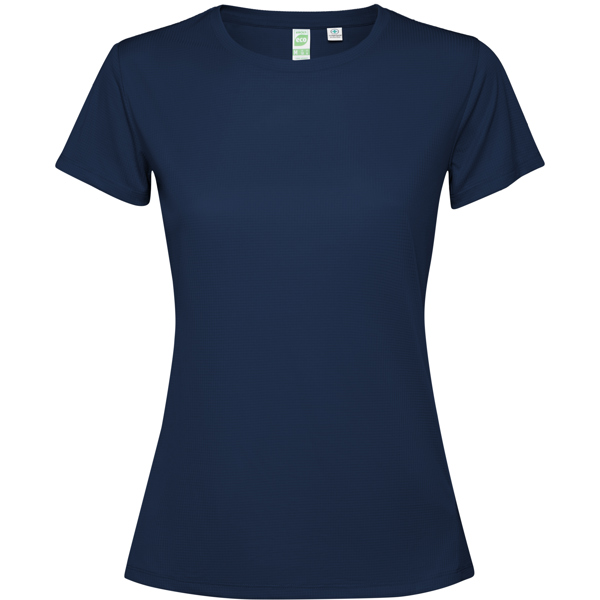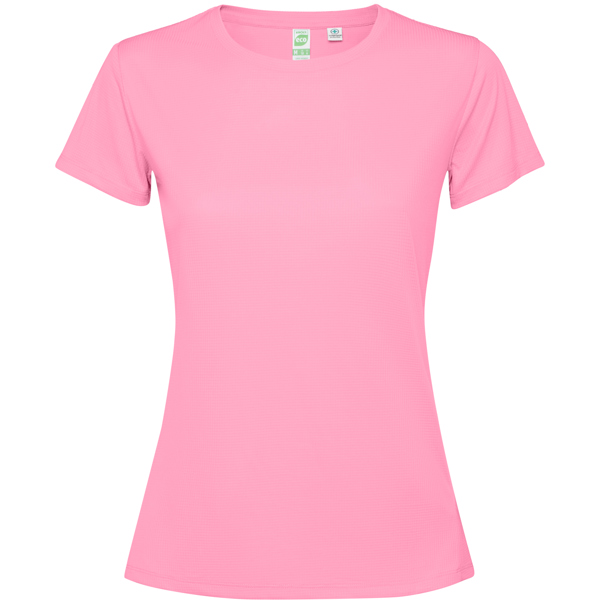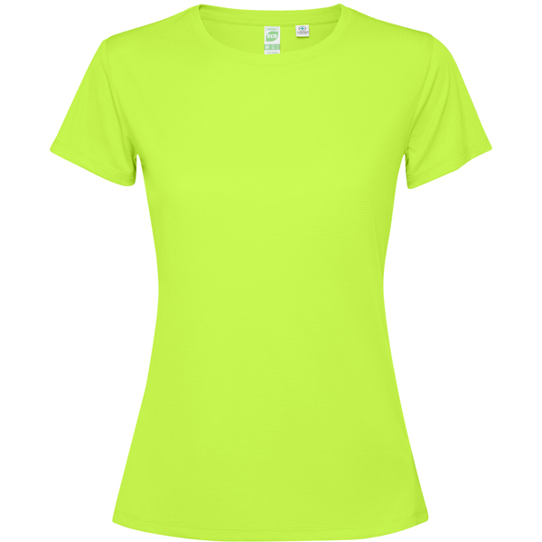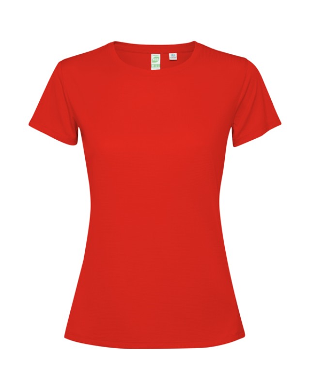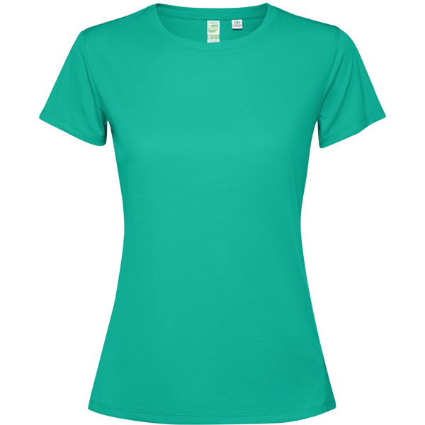 T-shirt tecnica aderente traspirante a maniche corte. Roly Control Dry. Anti-batterico. Orlo esteso sul retro. Cuciture laterali in avanti. Girocollo e nastratura del colletto tono su tono. Certificazione GRS. - Genere: Donna - Composizione: 100% poliestere riciclato, waffle interlock, 125 g/m² - * Duo* Etiqueta Removible* Antibacteriano* Control DRY* Tejido Transpirable* Tejido StretchProducto con certificado 139218-GRS - Misure: 42cm/63cm