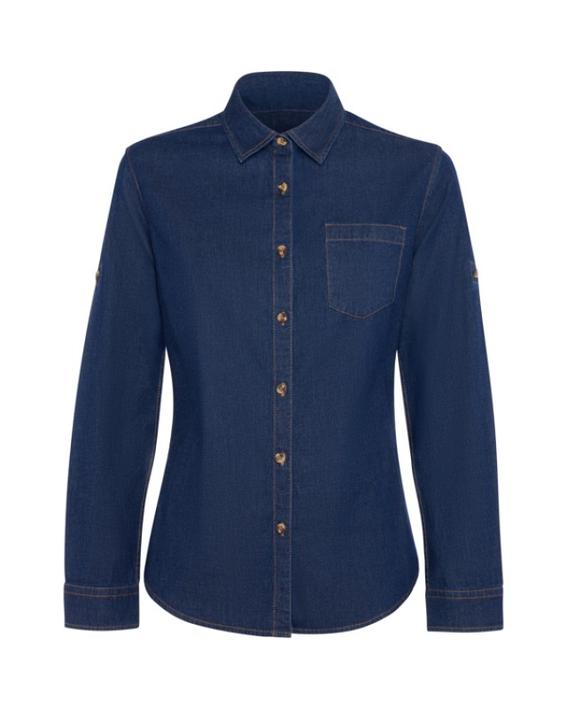 Camicia da donna in denim a maniche lunghe con passante regolabile.· Tessuto elasticizzato. · Girovita leggermente aderente.· Colletto a camicia.· Cuciture in avanti sulle spalle e carré sul retro.· Tasca a V sul petto a sinistra.· Polsini a doppio bottone con pinces e abbottonatura aggiuntiva sul polsino.· Pinces sul petto e sulla schiena.· Fondo arrotondato. - Genere: Unisex - Composizione: 98% cotone, 2% elastan, 210 g/m ²