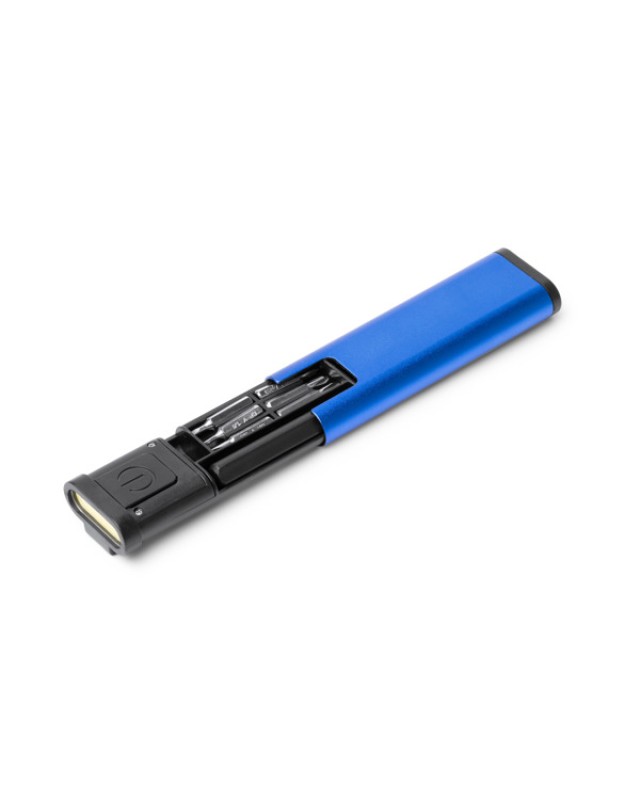 Utensile multifunzione ultrasottile con torcia, realizzato in alluminio con dettagli in ABS. La torcia ha una potenza di 70 lumen. All'interno presenta uno scomparto portaoggetti con manico e punte di cacciavite intercambiabili. Batterie a bottone incluse. - Composizione: Alluminio - Misure: 10,5cm/3cm/1,5cm