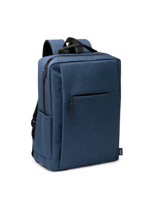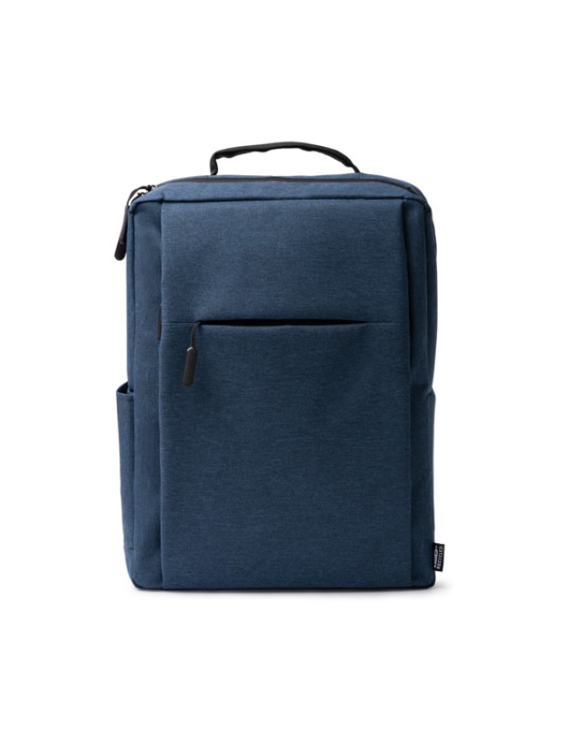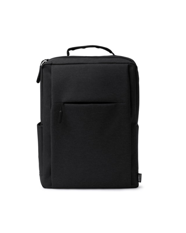 Zaino in RPET 600D con finitura screziata. Ampio scomparto interno con tasca per laptop da 15”. Tasca esterna con chiusura a zip e tasca laterale. Maniglie imbottite. Cinghia per trolley. Capacità 14L. - Composizione: RPET - Misure: 31cm/40cm/12cm