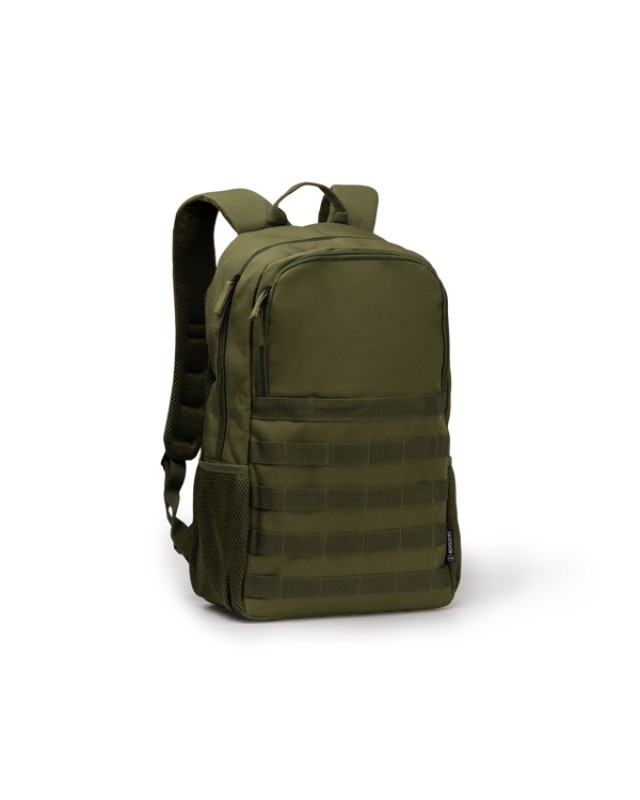 Zaino in resistente poliestere 900D RPET con schienale imbottito. Lo scomparto principale è dotato di una tasca imbottita per laptop fino a 15" e un'altra per trasportare oggetti di piccole e medie dimensioni. Tasca anteriore e due tasche laterali microforate con moschettone per garantire vestibilità e sicurezza. - Composizione: RPET - Misure: 47cm/30cm/15cm