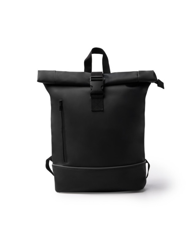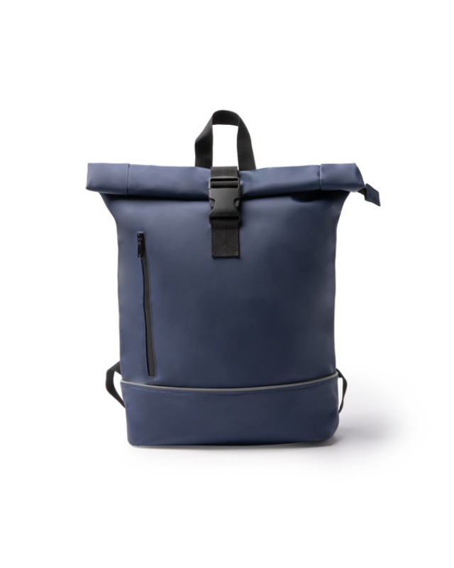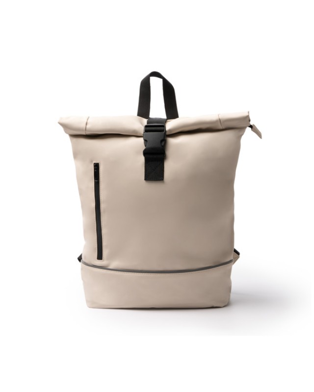 Zaino realizzato in PU e RPET 210D con scomparto principale allungabile dotato di chiusura a zip e fibbia. All'interno è dotato di uno scomparto imbottito per laptop fino a 15" e di una tasca con zip per gli oggetti più piccoli. Inoltre, include una tasca laterale esterna idrorepellente con zip, ideale per trasportare piccoli oggetti, e nastro catarifrangente nella parte inferiore. Schienale e manici imbottiti e cinghia per trolley rinforzata. - Composizione: PU e RPET 210D - Misure: 38cm/54cm/12cm