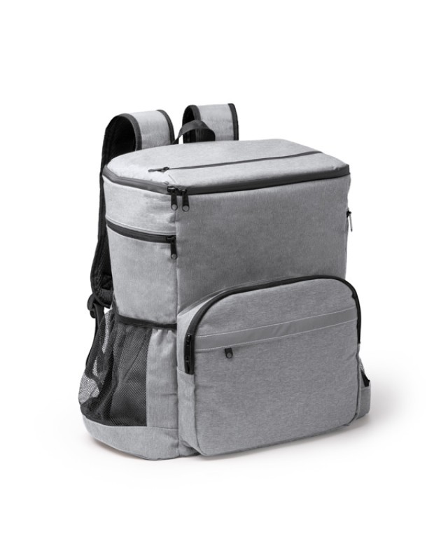 Zaino termico in RPET 600D. Dispone di uno scomparto principale e di una tasca superiore, entrambi con interno isotermico per mantenere gli alimenti alla temperatura ottimale e conservare snack più piccoli. Inoltre, questi scomparti sono dotati di chiusure a zip resistenti all'acqua per conservare gli alimenti in modo più sicuro e offrire una maggiore protezione contro l'acqua e l'umidità. Presenta una tasca frontale esterna con chiusura a zip e una striscia catarifrangente per migliorare la visibilità. Presenta inoltre due scomparti laterali con chiusura a zip e due scomparti aggiuntivi in mesh per trasportare altri oggetti come le borracce. Manici e schienale imbottiti. - Composizione: RPET 600D - Misure: 28cm/40cm/20cm