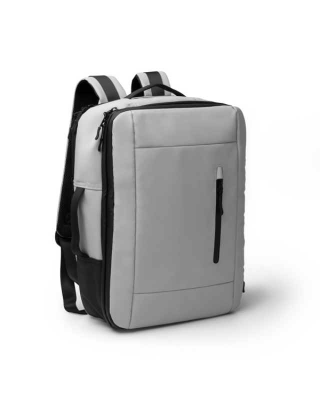 Pratico zaino da viaggio realizzato in pelle PU. Ampia capacità dovuta allo scomparto principale con divisorio in mesh con chiusura a zip e a un secondo scomparto espandibile con chiusura a zip. Include anche diverse tasche interne per gli oggetti più piccoli, una in mesh e un'altra in materiale impermeabile traslucido. Include uno scomparto antifurto imbottito con tasca interna, appositamente progettato per riporre dispositivi fino a 12". La chiusura a zip dello scomparto principale è idrorepellente, il che lo rende ideale per proteggere ciò che vi si ripone. All'esterno, è dotato di una tasca anteriore più piccola per le bottiglie. Lo schienale e le bretelle sono imbottiti, con fibbie sulle bretelle per una migliore regolazione e un'apertura posteriore per il trolley. - Composizione: Pelle PU e poliestere 210D - Misure: 26cm/45cm/20cm