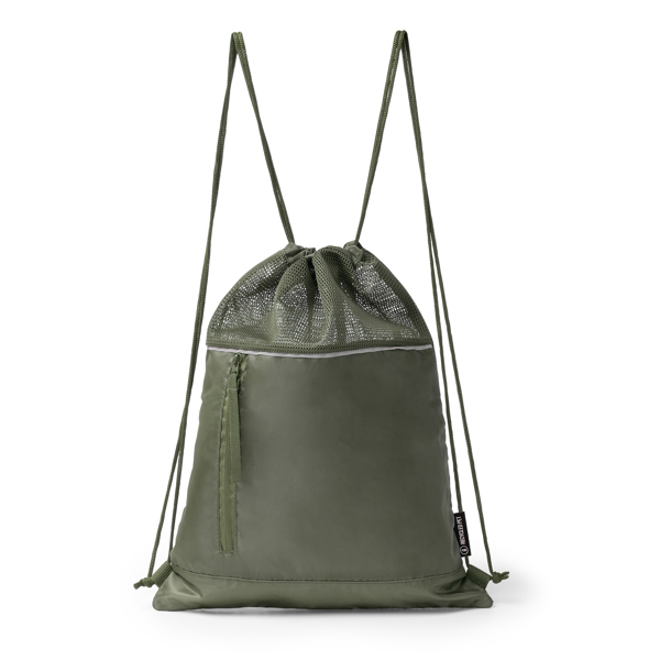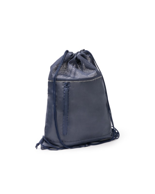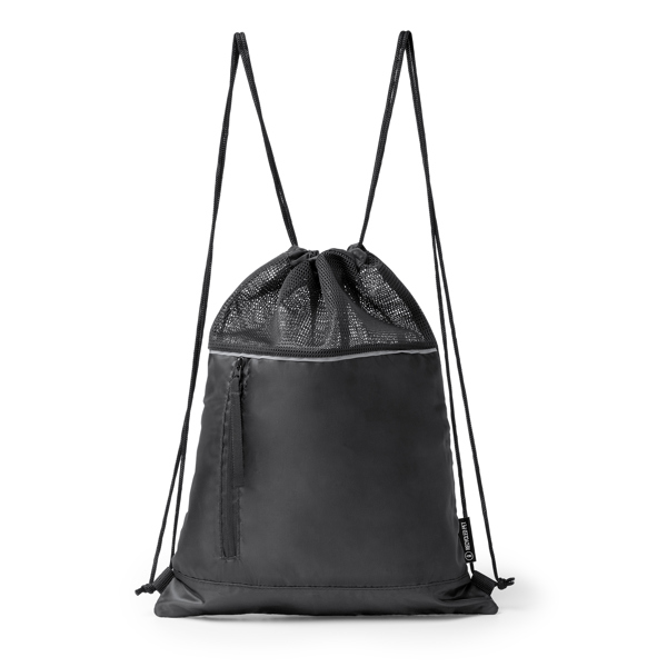 Zaino con coulisse realizzato in RPET 210D con tessuto in mesh sulla parte superiore e posteriore. Dispone di una tasca anteriore esterna per gli oggetti più piccoli e di una fascia anteriore catarifrangente. Questa tasca include un tiralampo in tinta con lo zaino. Opzione pratica e leggera. - Composizione: RPET 210D - Misure: 35cm/45cm